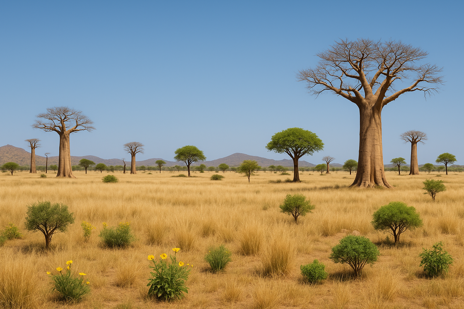 The majority of Urtz’s terrain is made up of wide, open savannas and undulating grasslands, with tall, golden grasses swaying gently in the dry winds. These vast plains are interrupted by seasonal rivers and shallow, often cracked, salt pans. The flora here is sparse but resilient—thorny acacia trees and hardy shrubs dot the landscape, and the occasional baobab or giant cycads rise from the horizon like sentinels.