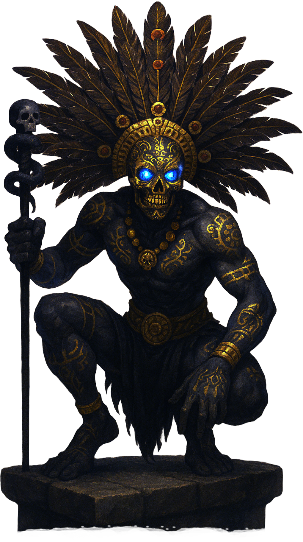 To those who have seen him, Banzala frequently manifests as an eight-foot-tall, athletic human male with dark skin patterned with golden tattoos, and decorated with ornate jewelry and small bones. He wears an enormous crown of black feathers and possesses a grinning, extravagantly decorated skull in place of a head, with burning, icy-blue eyes. He is often seen with a serpent, coiled around a cane of bone, and an owl. Many times, his size may vary from eight feet all, to a massive thirty feet tall should he desire to look imposing. He is said to be able to manifest anything he desires at will that serves the moment.Tenets of Faith