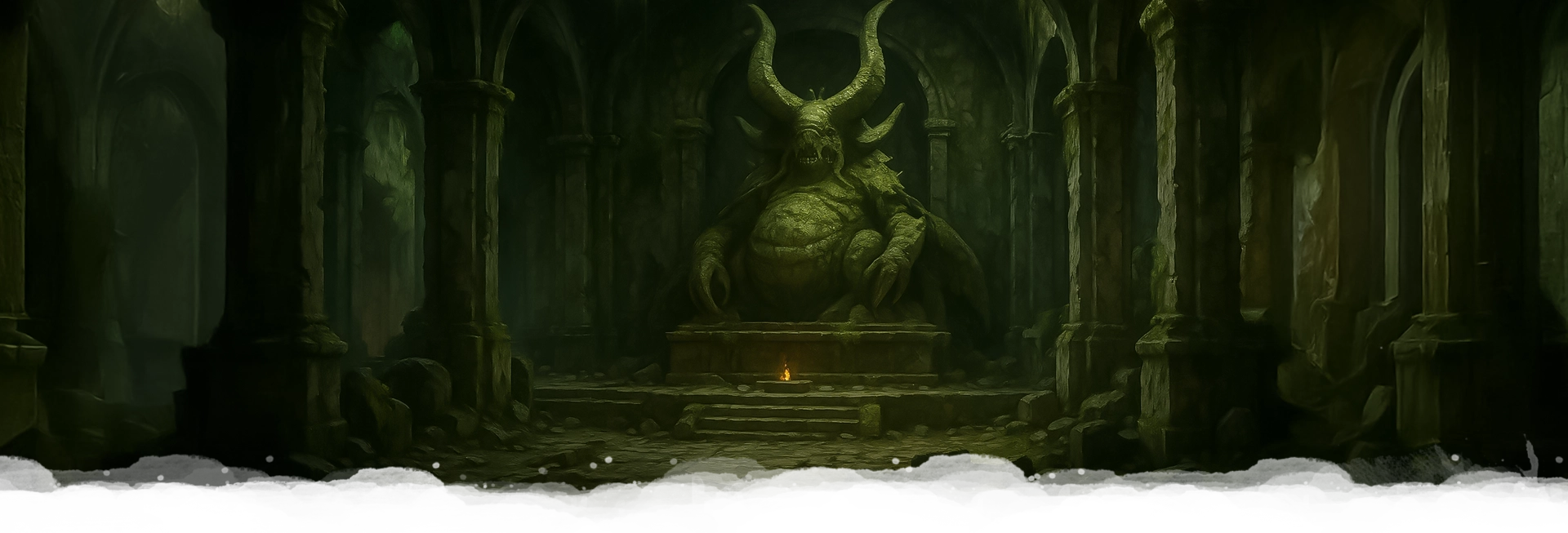 Belphegara manifests as a grotesque hive-queen enthroned upon a mound of carrion husks. Her bloated body is half-woman, half-insectile warren: swollen flesh studded with hive-like cavities where flies and beetles nest, her withered limbs dangling like forgotten roots. Her face is gaunt yet eternal, eyes clouded with milky film that drips a soporific ichor. From her slack jaws spill both spores and whispers, each word a sigh of surrender. Her wings, once angelic, have rotted into a cloak of leathery folds, hanging limp and buzzing weakly with the drone of infestation. In iconography, she is depicted not as a figure of power but as a ruinous idol: statues slumping with mold, murals fading into mildew, altars draped in fungal growth. Her sacred symbols include the broken hourglass leaking sand into stagnant pools, the fly-trap flower swallowing its own petals, and the ouroboros collapsing inward into nothing. Shrines to Belphegara are rarely tended, for neglect itself is her liturgy: mold creeping unchecked across the altar is considered the highest ornament.Tenets of Faith