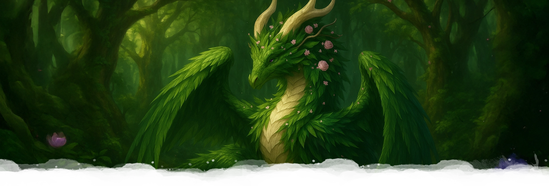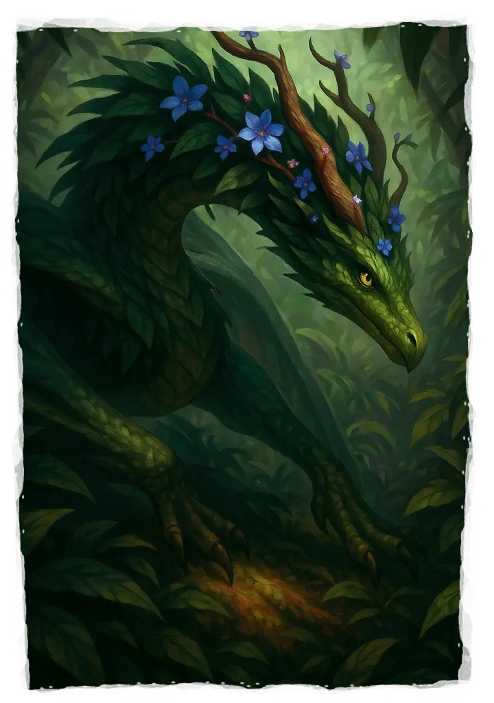 Emerald dragons live in harmony with the seasons. In spring, they sow and nurture, filling their groves with new life. Summer brings vitality and active defense of their domains. Autumn is a time of harvest and reflection, where they gather seeds and prepare for rest. Winter sees them contemplative and still, often slipping into disguised lives among mortals or retreating deep into meditation. Their lives span 800–1,000 years, with ancients embodying the forests they inhabit. Their horns may branch like trees, their scales gleam with radiant depth, and plants flourish wherever they tread. To mortals, such dragons are indistinguishable from gods of the wild, guardians whose long memories carry the weight of centuries.Habitat & Ecology