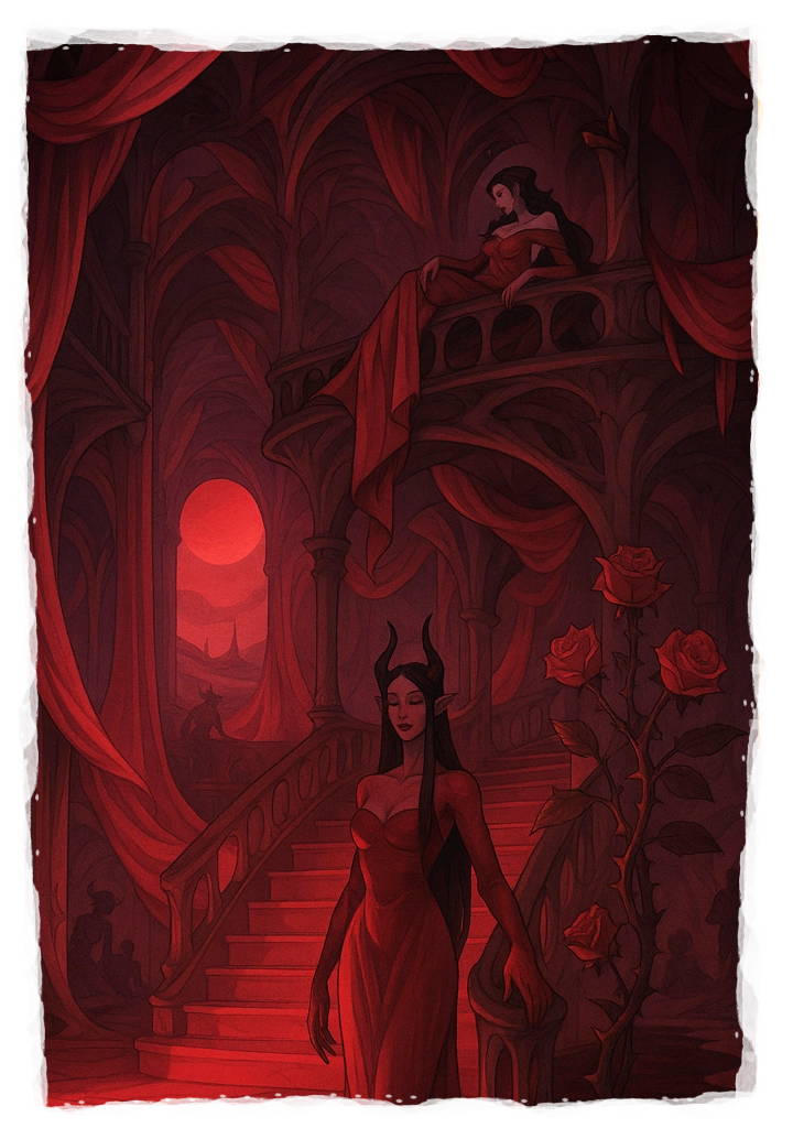 Born of Asmodia’s own divine excess, the Houses were shaped not through mortal hands, but through the unchecked tide of lust itself. Asmodia poured their essence into the emptiness of the Void, weaving silken palaces and grotesque manors from the very fabric of temptation. Yet the realm did not grow by their will alone. Every whisper of forbidden desire, every dark fantasy nurtured in mortal hearts, bleeds into this plane. With each unspoken craving, the Houses swell, their foundations fed by the ceaseless hungers of countless souls. In this way, the dominion is both Asmodia’s creation and a reflection of the mortal world’s hidden appetites, an eternal mirror of indulgence turned monstrous