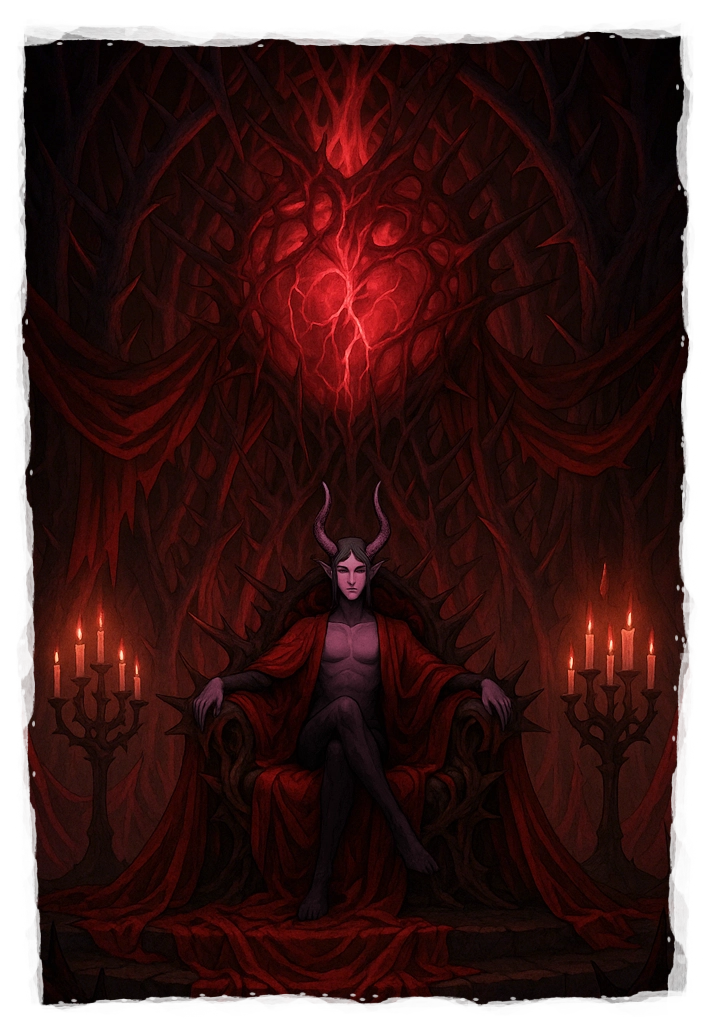 At the center of the realm lies Asmodia’s palace, a vast cathedral of barbed obsidian and silken shadow. Its walls throb with veins of crimson crystal, sprouting into jagged thorns that twist overhead like the ribcage of some colossal beast. At its core beats the great living organ known as the Heart, pumping a dark ichor that seeps into the wastes, sustaining the endless ecstasy of the realm. Here, Asmodia manifests most often, enthroned upon coils of veined stone and crimson silk, their palace doubling as both temple and prison. The Heart’s pulse shapes the rhythm of the plane itself; when it slows, the manors fall silent, and when it quickens, the entire demiplane shudders with frenzied lust.
