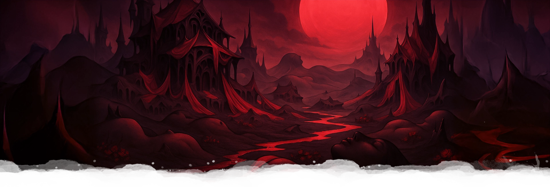 Though the land offers no natural beauty in the mortal sense, it captivates with its own infernal allure. The endless black plains gleam faintly under the red sun, casting long, sinister shadows that ripple across the flesh-stained hills. From the heights of any House, the view stretches into a horizon that never ends; an ocean of dark indulgence, broken only by the silhouettes of other distant manors rising like teeth from the barren earth.