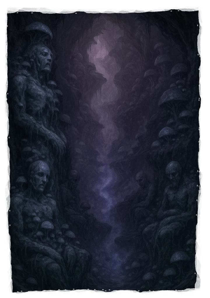 The caverns stretch endlessly downward, an infinity of hive-like hollows carved in stone. Their walls sag with mold and glisten with moisture, bulging as though alive. Fungi bloom in mats across the floors, pulsing faintly with a rhythm that lulls intruders into stupor. The silence here is oppressive, broken only by the drone of unseen insects or the drip of stagnant water. Nothing grows in vibrancy, nothing decays in haste; everything clings in a state of half-death, as if the realm itself resists the release of ending.