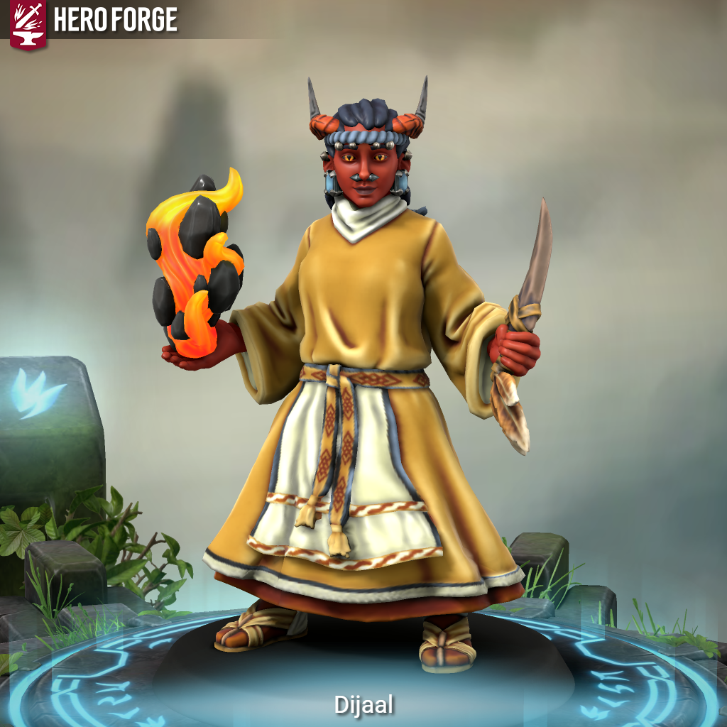 The Dijaal are a secretive and mysterious species in the Land of Ki. Counted amongst the minor races, the Dijaal inhabit the harshest reaches of the Southern Wastes. Known for their reddish skin tones and ram like horns their unique appearance add to their mystery. Due to them residing within the inhospitable desert lands much about their culture, society, and history remains unknown, making them a subject of interest for scholars in Ki and in particular the Council of Eridu.