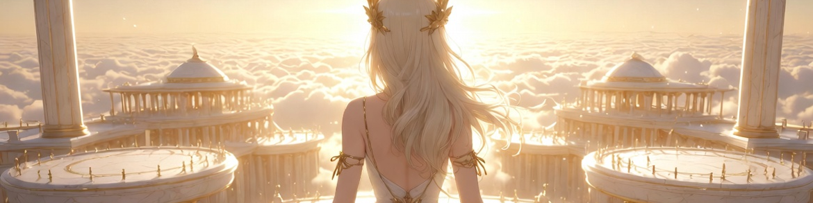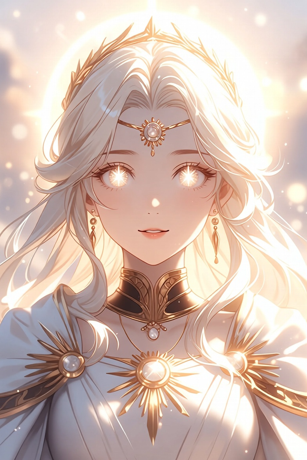 Her gown is white flowing silk trimmed in gold, drifting as though carried by a permanent sunrise breeze. A crafted halo hovers above her head — a ring of engraved sunfire, not symbol but substance. Smiling at her feels like admiring a perfectly lit portrait. Being judged by her feels inevitable.