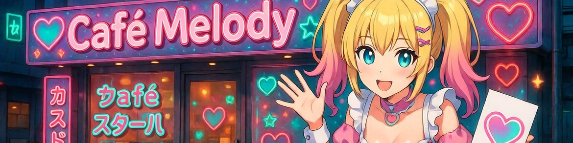 Café Melody is the brightest sound in Hoshizora — a sugar-coated explosion wedged between two sensible buildings that have long since given up trying to contain it. The sign out front pulses in shifting pastel colours, as though the café itself cannot decide which shade of joy to wear today. Music spills from the doorway. Laughter follows it. Occasionally, so does someone running for their life.
