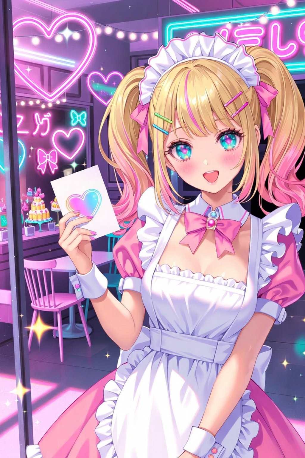 Stepping across the threshold feels like being tackled by affection. The scent of bright fruit teas, whipped cream, and warm pastries coats the air. Every table is adorned with decorative ribbons. Every chair is slightly too cute to be safe. The walls gleam with charm-chains, signed photos of the maids, and glitter-painted murals that absolutely were not approved by local authorities.