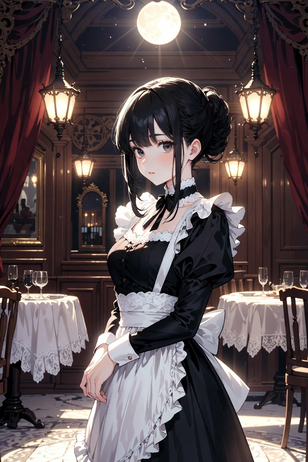 Uniforms are crisp monochrome, aprons pressed flat, bows tied with geometric perfection. Every motion—pouring tea, adjusting cutlery, setting down a tray—flows without interruption or wasted gesture.