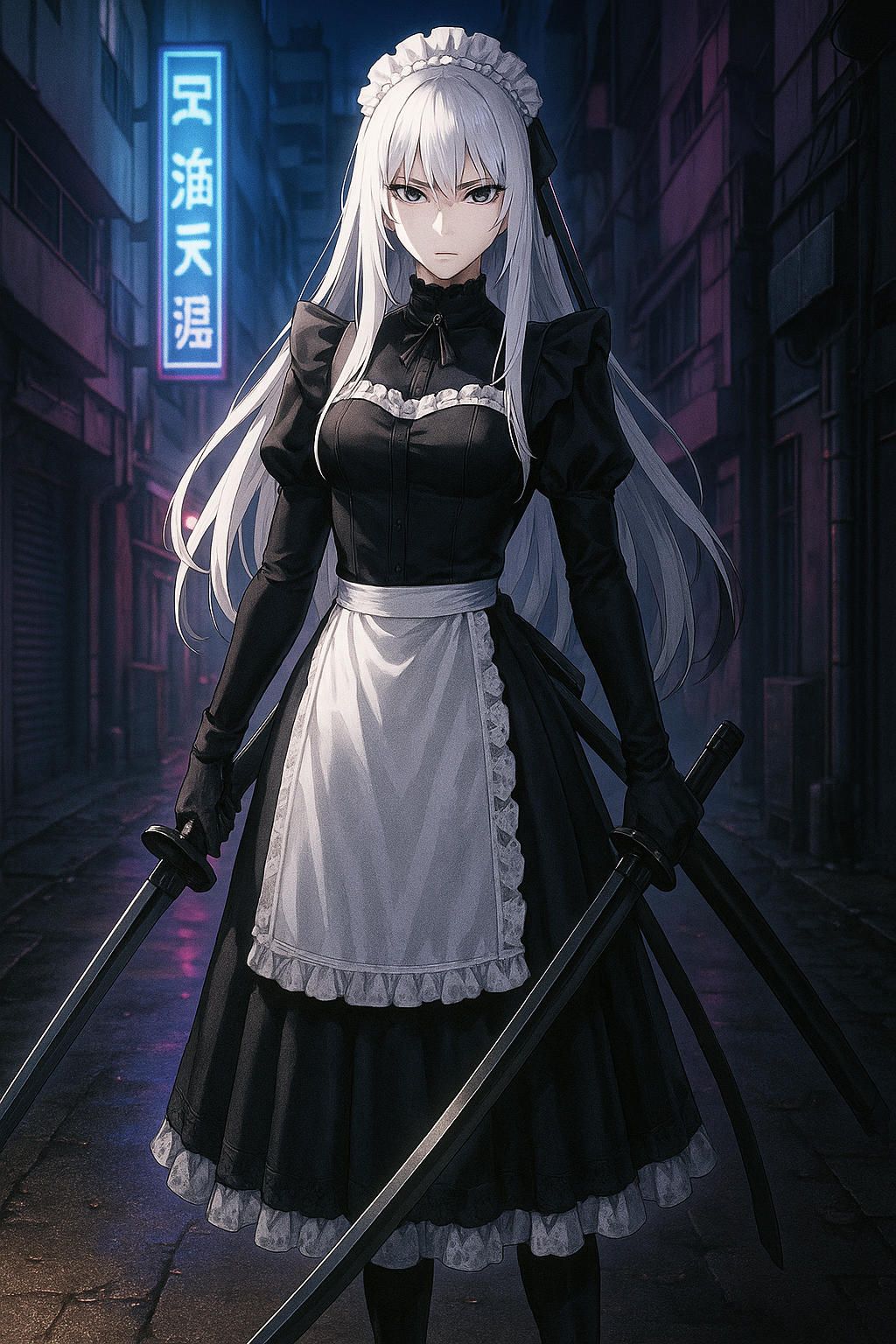 In the alleys and service lanes of Hoshizora, Noir’s maids move like a whispered verdict. Their combat is elegant, efficient, and devastating—the kind of brutality that looks almost choreographed, where a gloved hand redirects a strike with minimal effort and a blade, when drawn, interrupts an argument so thoroughly that the night forgets it ever happened.