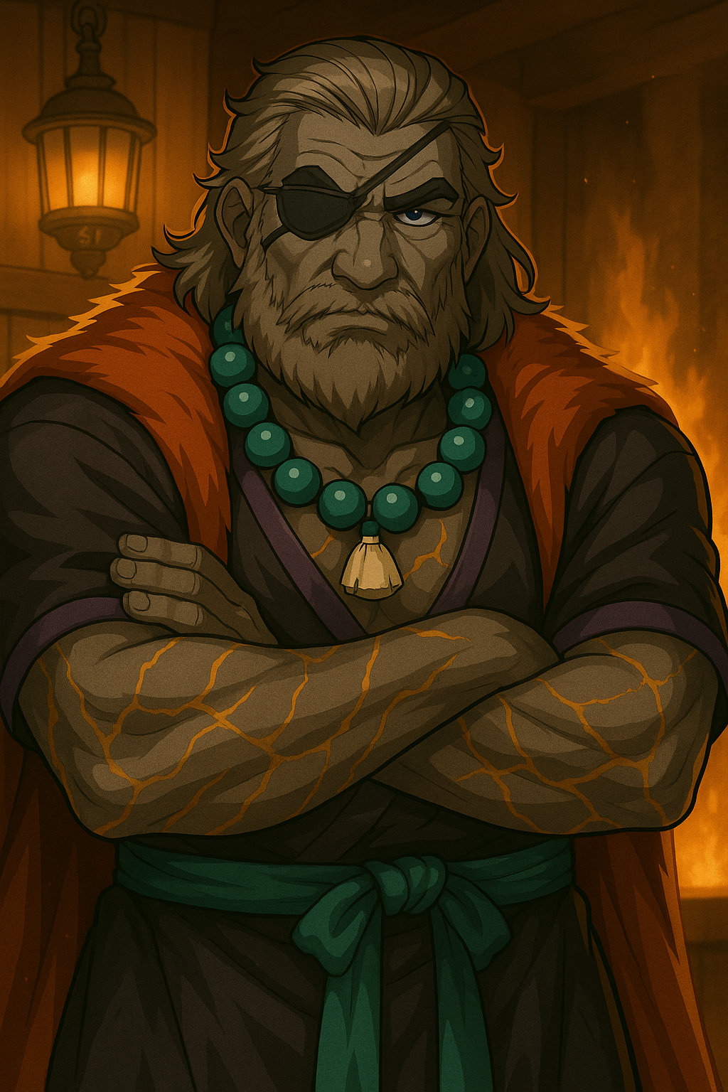 He dresses simply: hakama-style trousers, a heavy sash, an apron when he works. In the forge he strips bare to the waist, soot and scars worn as naturally as skin. His hair is tied back without ornament. Nothing about him is decorative, yet everything about him is deliberate.