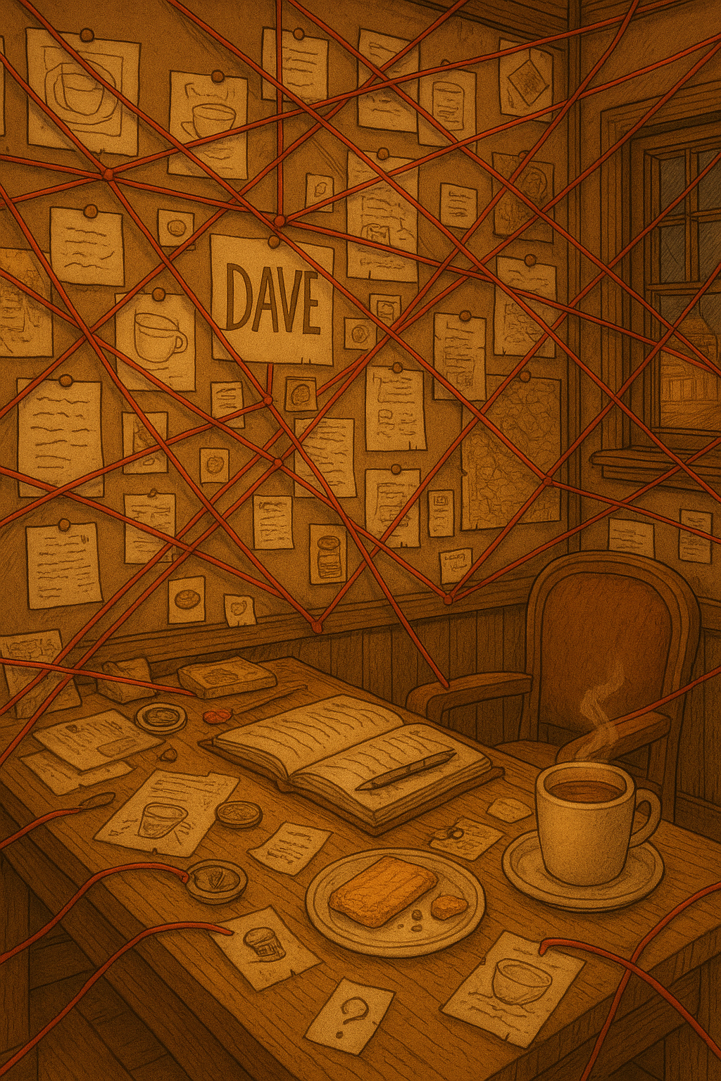 But ordinary comforts here do not behave. Conversations last longer than the clock allows. Candles flicker backwards before correcting themselves. The fourth chair alters shape depending on who dares to sit, as though judging their claim to it. And the window—inevitably, insistently—overlooks Dave.