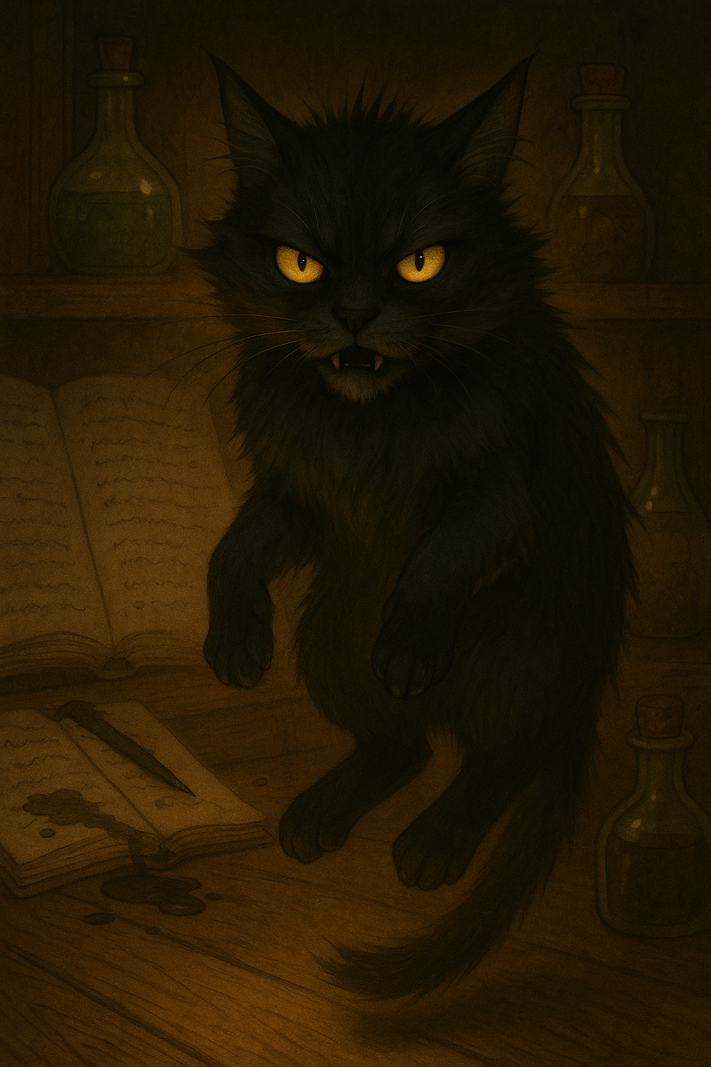 He prowls without touching the floor, drifts over patrons’ shoulders, and leaves pawprints on ledgers as if signing bargains on their behalf. Inkpots topple when he is displeased. Bottles shiver when he hums. Patrons whisper that Smudge can even sense the lies people tell themselves, and that his stare alone is enough to force a guilty conscience to the surface. Those who bargain in the Cottage quickly learn the rule: when Smudge rumbles, the price of your deal has already changed.