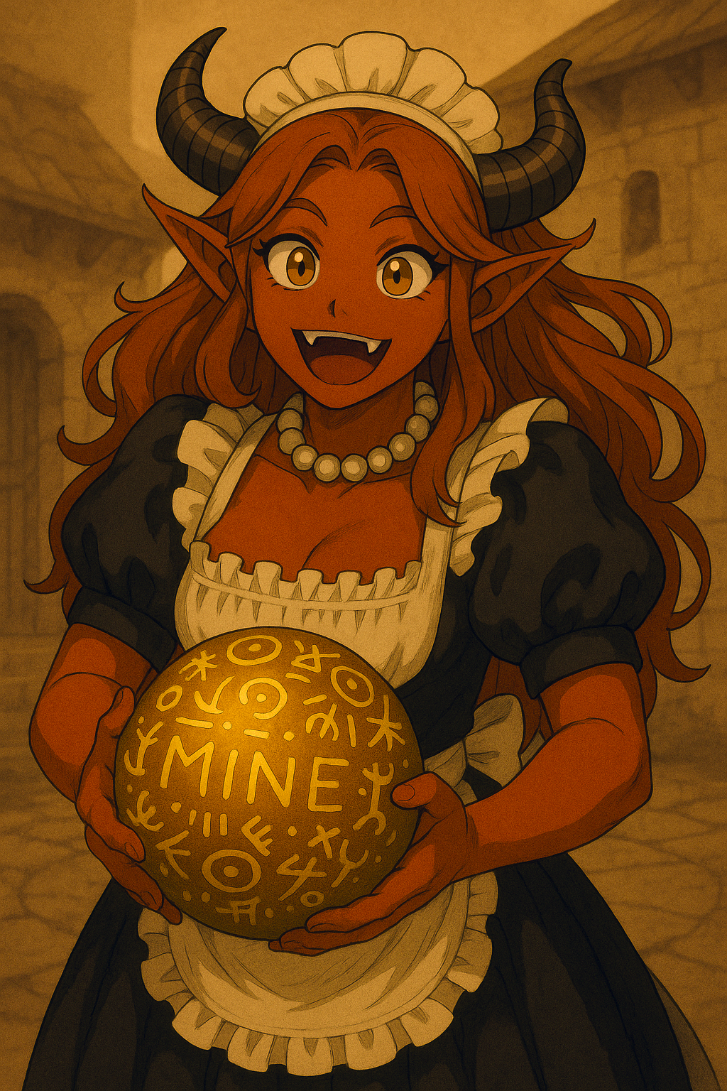 Glyphs wander lazily across its skin. They move only when unobserved, assembling playful images of bounding spheres, clenched fists, and the word MINE written in seventeen scripts that predate half the Realms. The Ball hums with a soft resonance that unsettles books on their shelves, and that resonance deepens whenever Rika approaches. It never quiets for any other hand.