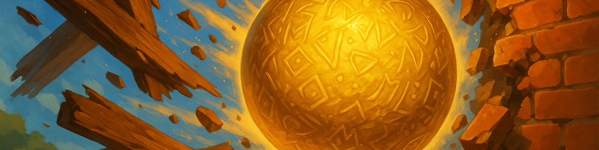 The Ball retaliates with exuberant precision. The courtyard, long resigned to this ritual, prepares itself for structural inconsistency. Glyph-marks shimmer across the Ball in radiant figures that tally the score, visible even from the highest casements. Their glow conveys unmistakable delight, as though the relic enjoys pretending, briefly, to be ordinary.