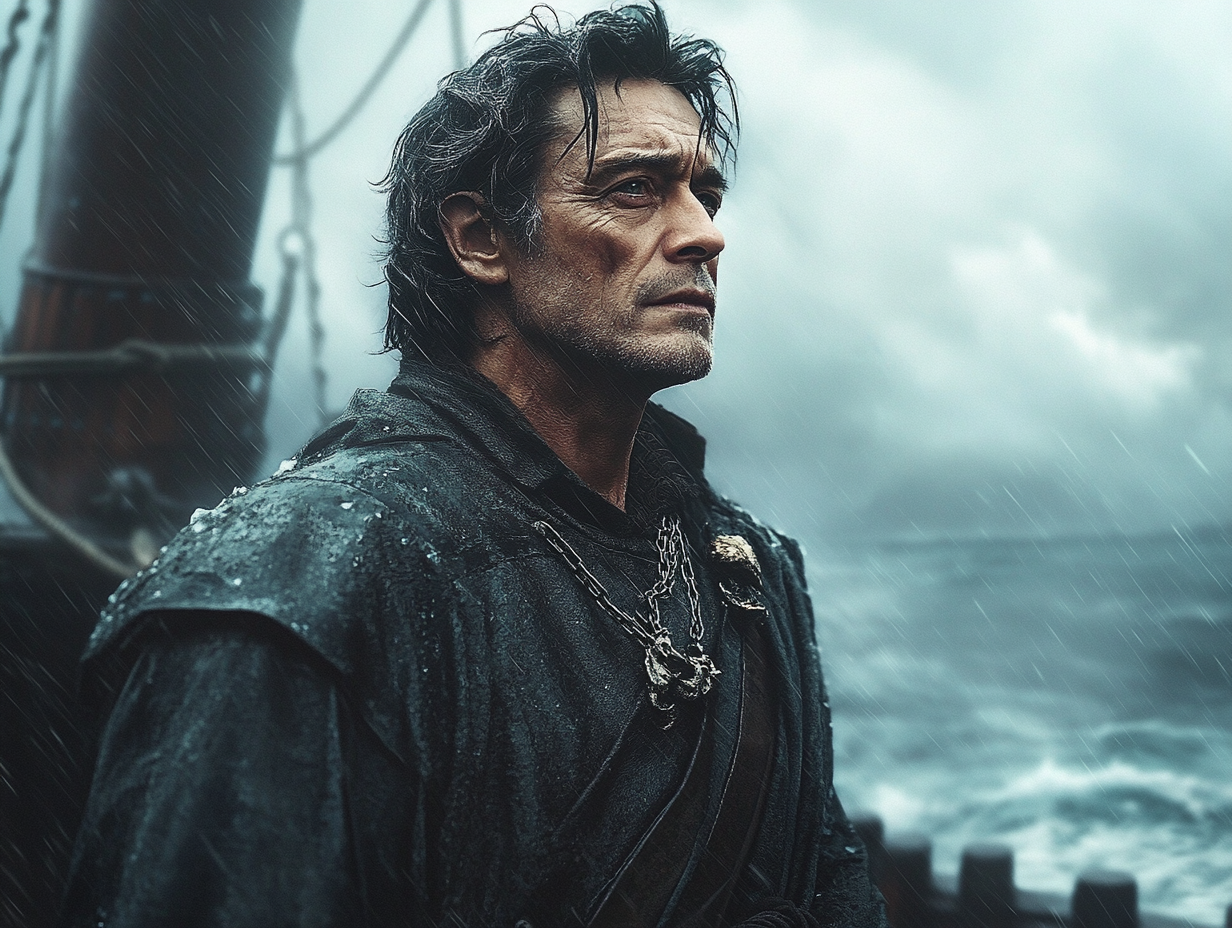 A weatherworn man with salt-matted hair, lined eyes, and a calm, unnervingly serene gaze. His storm-stiffened cloak carries the scent of sea spray and secrets. Around his neck hangs a necklace made of barnacle-encrusted bone, disturbingly old and possibly human in origin. He always seems to be listening—to the wind, the waves, or something deeper.