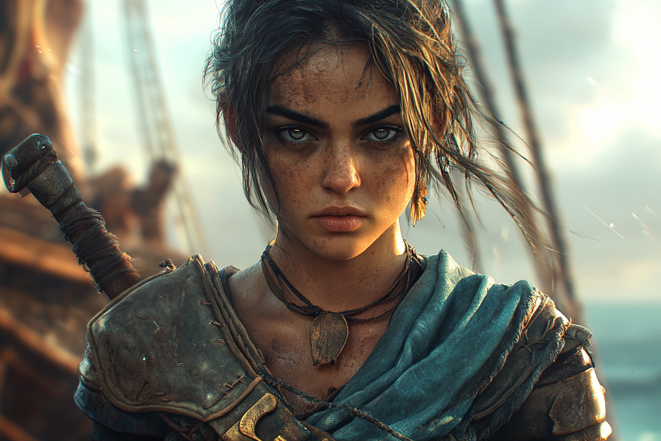 A sharp-eyed woman with wind-tangled hair, a weathered cloak, and the lean build of someone who earns her meals by hauling rope and swinging blades. Her left hand is missing two fingers—she never mentions it. Her voice is clear, confident, and direct. Always has a dagger within reach. Always knows who’s watching.