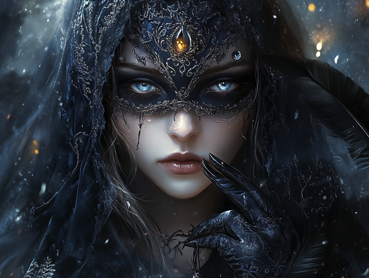 A figure swathed in pitch-dark wrappings, each thread drinking in light as though stitched from shadow. Her mask, woven of midnight silk, conceals her face entirely—save for the gleam of sharp, amused eyes.