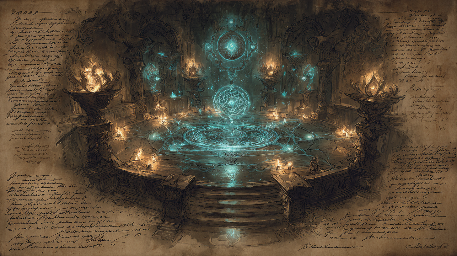 The path led them into the operations ring where Deepwarden Sythar Alcarin oversaw the lattice. A chamber of glassy coral shimmered with mirrors and angled crystals, glyphs pulsing like equations solving themselves. Through translucent reef, the party glimpsed the mythal’s heart: a radiant node pulsing like the beat of a leviathan.