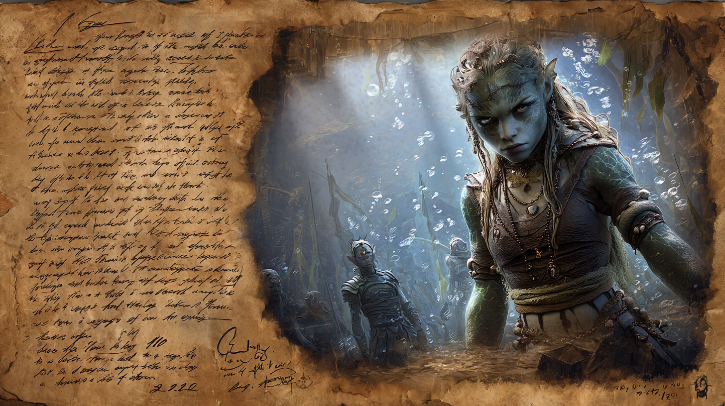 Next, the party descended to the archives, a labyrinth of coral shelves and memory pearls stretching into shadow. Lantern-barnacles glowed faintly, while pearls thrummed with whispers like a thousand voices pressed into silence. The water tasted of resin and salt, heavy with centuries of recorded history.