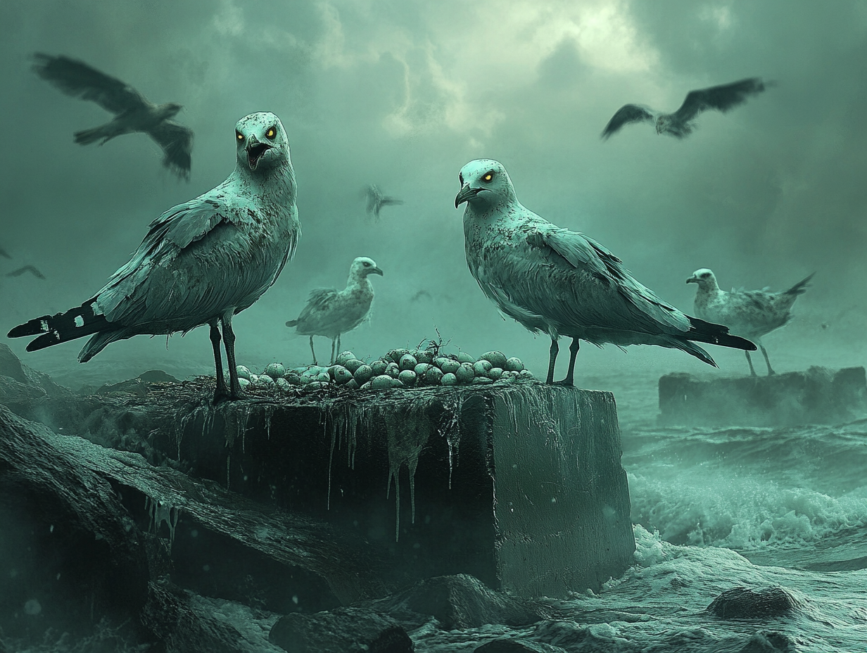 About halfway across the rocky rise, you spot dozens of oversized, haggard seagulls nesting among the stones. Their feathers are patchy and dull, their bodies slick with tide-corrupted slime. The nests are littered with mottled eggs, shredded fish, and... something more human.