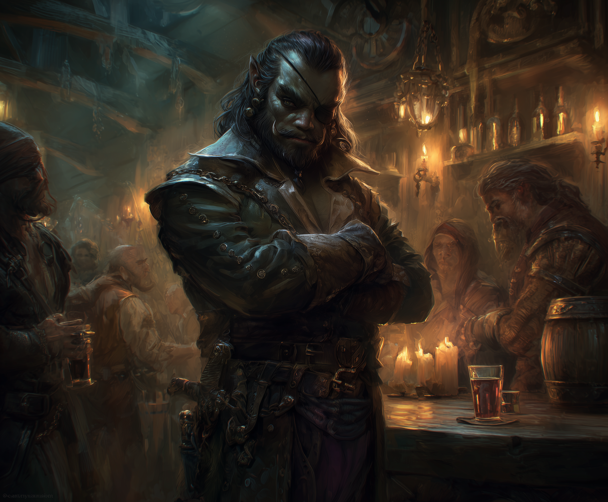 He speaks only in Orc and coin, and rarely uses more than a grunt, a nod, or a boot. But he sees everything. Start a brawl, spill a drink, or raise your voice at the wrong person, and Tug’s already behind you.