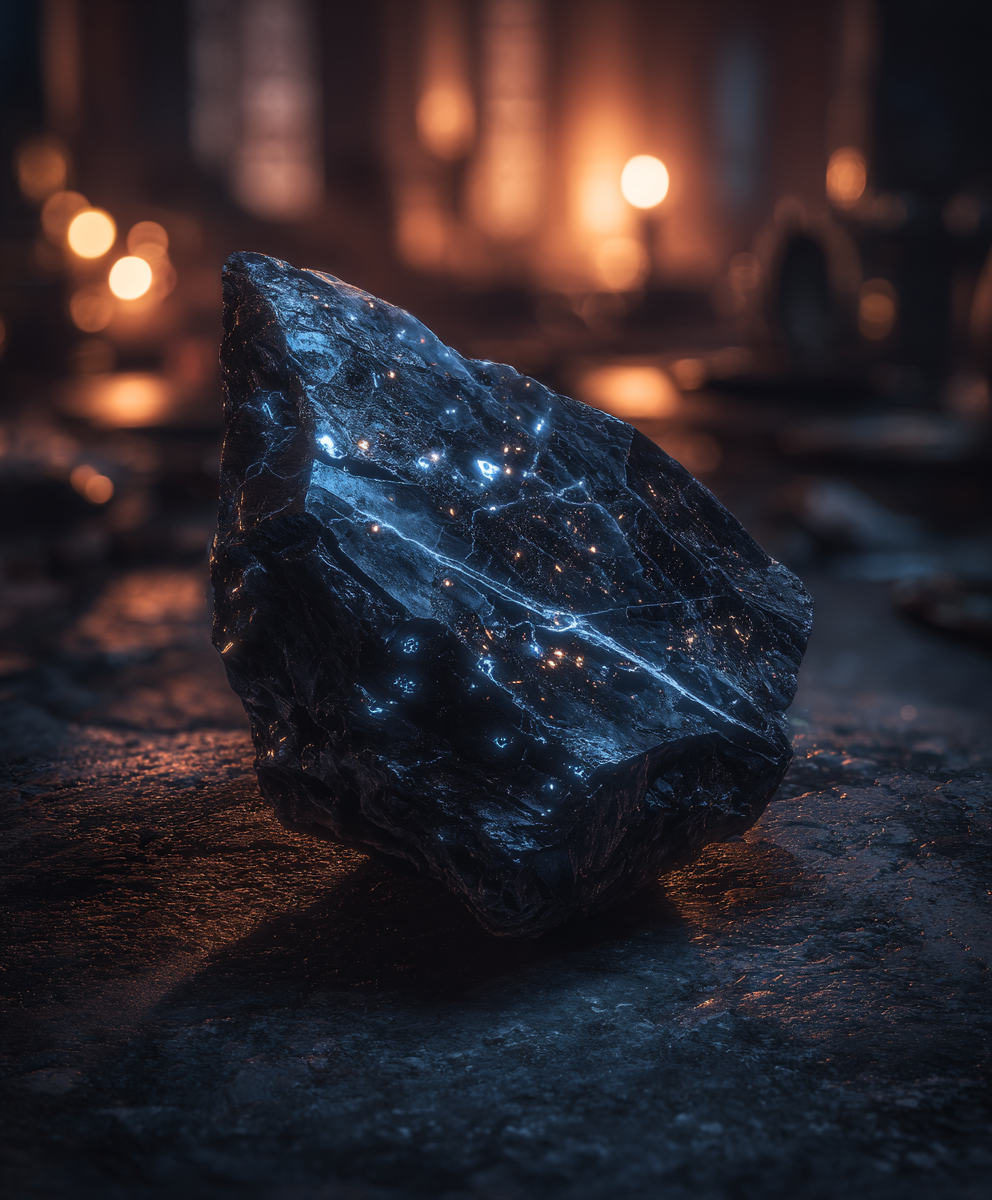 Recently unearthed in the deeper levels of the Leilon mine, this obsidian-like mineral appears smooth and dry, yet feels oily to the touch—a sensation that seems to bypass the fingers and go straight to the mind.