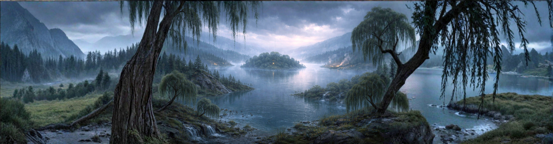 The lake’s atmosphere is as defining as its shape. Weeping willows crowd much of the shoreline, their trailing branches perpetually brushing the surface, and a faint, near-constant drizzle hangs in the air even when the surrounding countryside lies dry. Mists gather at dawn and dusk, blurring the far shore and lending the water an illusion of greater size and depth than it truly possesses. Though fed by freshwater streams and rainfall, Lac du Chagrin feels enclosed and inward-looking, as if reluctant to give up its waters or its secrets.