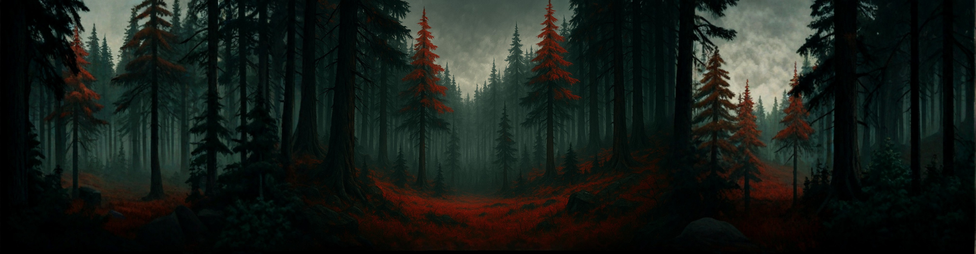 The western reach of the Bleeding Wood presses hard against a vast coniferous rainforest, older and darker still. Here the forest wall rises in towering ranks of ancient trees whose interlocked canopies admit little more than a dim green twilight. Sunlight rarely reaches the forest floor, and what little does is quickly swallowed by shadow and mist. The air is heavy with moisture and the scent of resin, rot, and living wood, lending the place a hushed, oppressive stillness broken only by distant calls and the soft drip of condensation from needle to needle.