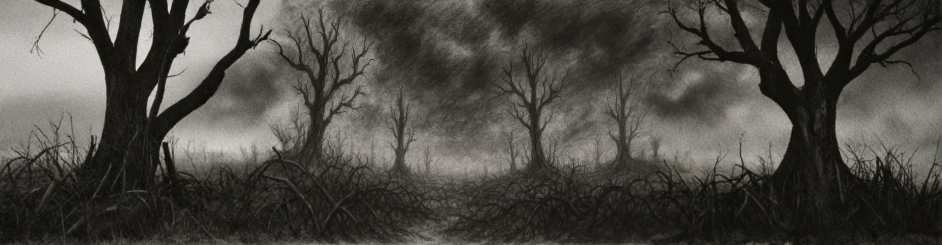 The Sooty Bramble lies beneath a sky of slow-turning ash, a twilight realm where the smoke never clears and the light never fully returns. Every inch of its blasted ground is choked with blackened bramble coils—strange, brittle things that resemble the serpentine trails of the old-world “snake” fireworks. They twist and curl as though grown from ember and soot rather than sap and earth, each branch a crusted spiral of dark ash. Some still faintly glow at their cores, stretching by imperceptible degrees, as if continuing to grow long after the spark that birthed them should have gone out.