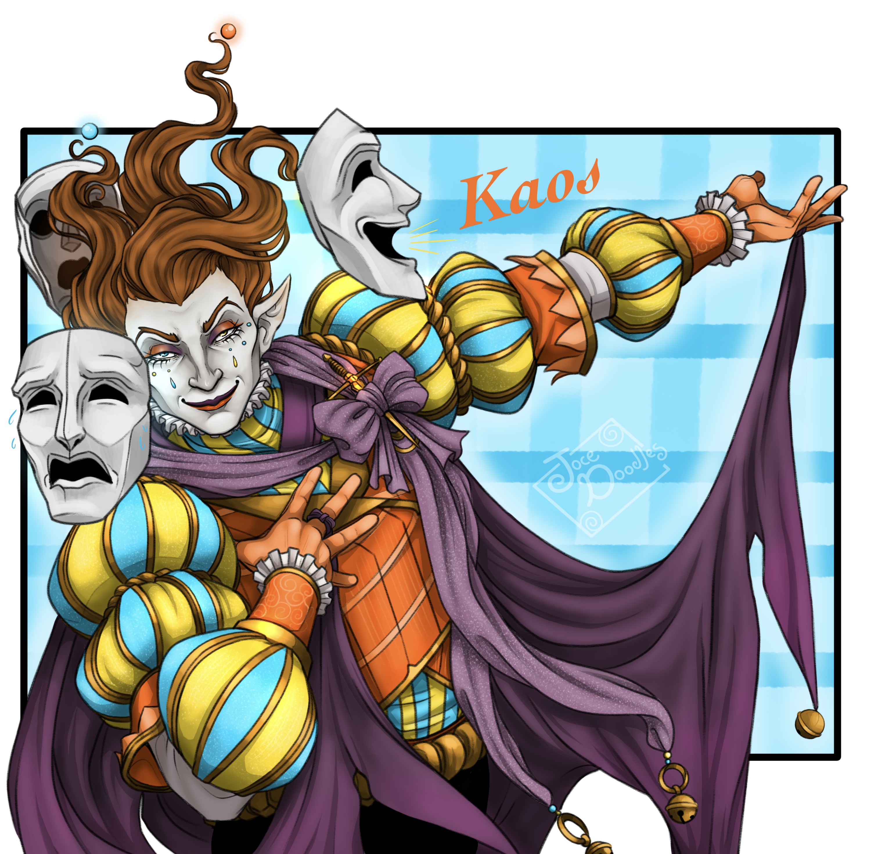 Syrios form cracks and breaks, as another form manifests. The new form bows and gestures broadly as three theatrical masks shift around the space. What droll conversation; let's make this a bit more entertaining, shall we! And suddenly Viren doubles over, seemingly fighting back something. Teagan is struck by the need to dance as Aiaoue goes bird and moves into the fray. Yenush realizes that he was lying when he said he was going to shoot the clown. Instead, he dodges and moves to flank. Teagan hurls the trident at the figure, though ends up shattering a portion of the bar instead.