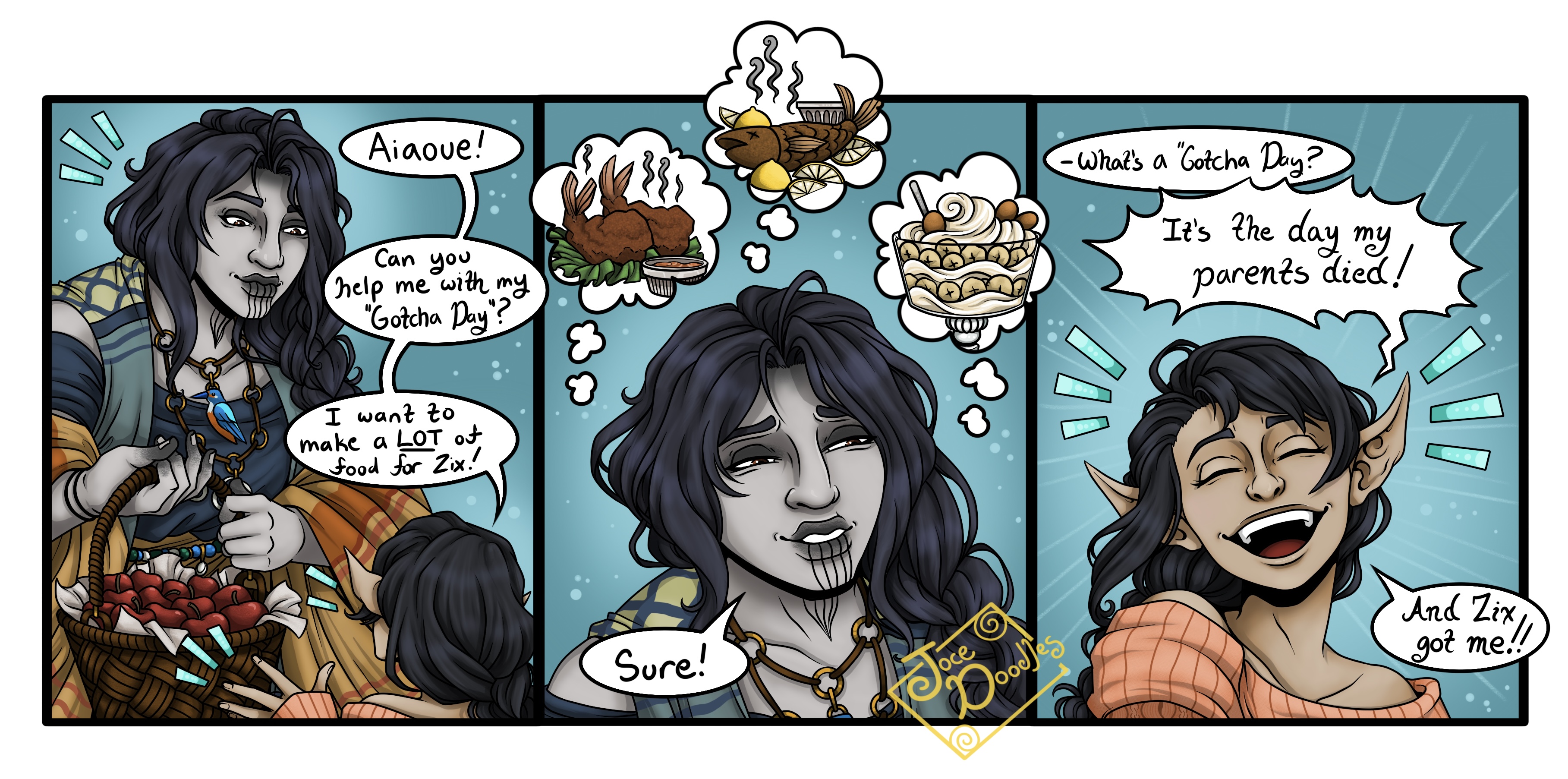 After some discussion, the group decides to continue their investigation by talking to Viren. Cadence mentions that perhaps "the bitch" (Omarosa) orchestrated the theft. And since her boss is technically Viren, perhaps he could help? On their way to the clinic, Aiaoue is stopped by the young Briella who reveals she has acquired a bunch of apples. As Aiaoue begins to reach for a trinket to give her in trade, Briella asks if instead Aiaoue would help her with something? Her "Gotcha Day" is coming up and she wants to cook a lot for Zix! Would Aiaoue share the recipes she mentioned? Aiaoue agrees and asks what a "Gotcha Day" is. Briella, still very happy, responds that it's the day her parents died and Zix got her!