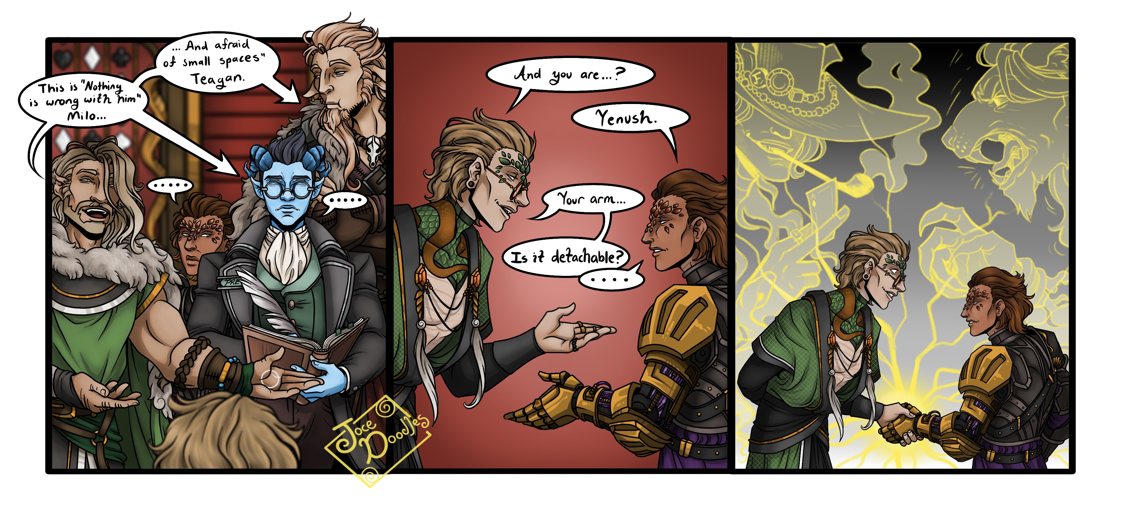 Teagan, now also out of the water, blatantly asks what the heck Quill even does around here. Quill shrugs: he helps with the shipyard; he's pretty strong. Oh yeah? How about we arm wrestle then. Quill accepts and Teagan rages... and feels spectral hands dig into his own. Seconds into arm wrestling, Teagan suddenly punches Quill straight on, sending the "tiefling" staggering back. After a moment, Quill's form is covered with ripples of lighting and thunder echoes around him. When he looks up, his eyes are sparking.