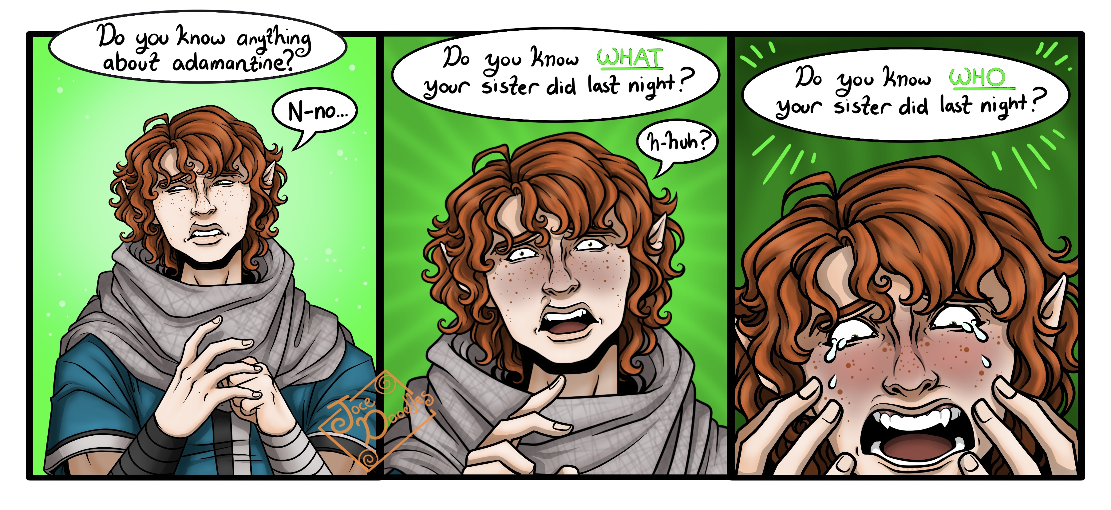 The group once again reconvenes at the tavern. Yenush and Arkyn talk about what happened with Sayah. The others discuss a glorious plan about how to resolve the adamantine issue. Teagan thinks Cadence would like the mines since they're dark, so why don't they go there? Tell Jeff you want to do some overtime to make up for being late and we'll just get more of the bone-metal! Speaking of the material, Cadence asks Teagan if he can break off a small piece. Teagan tries twice and on the second attempt, his warhammer gets wedged in the metal. For a moment, he feels as if he's drowning and feels three spikes pierce through his abdomen... before he snaps back to. Yeah, Cadence, I don't think I'm going to be able to split this for you.