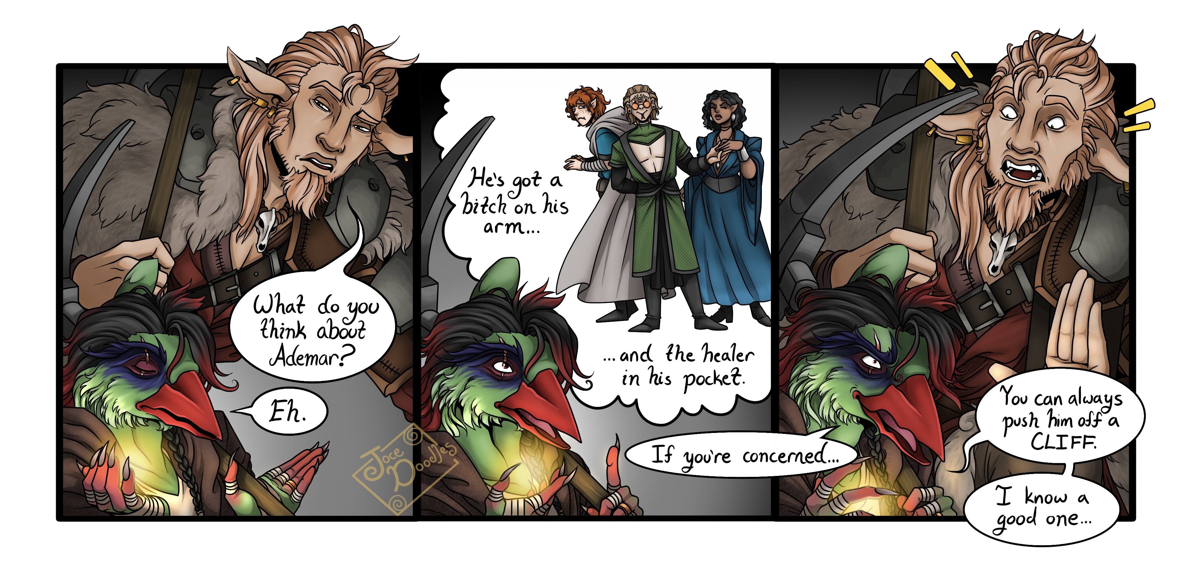 Recovening at the tavern for lunch, Yenush realizes he'll have to work when he sees Jinoah asleep at the bar. Teagan passes around the weird bone-metal. Yenush doesn't feel anything when he holds it in his left hand, but does feel the odd nausea when he holds it in his right hand. Cadence seems... fine with it. It's almost pleasant. The wave of uncertainty is of no concern for Cadence knows... though she's not sure what she knows. The group discusses how to approach the Ademar situation. Teagan mentions that Jeff suggested they murder him. Maybe they should try and talk to Viren? Or perhaps talk to "the bitch"? As they sort out their plan a... plan b... and so on, Yenush decides to get an hour long fiddle lesson from Bryant. The old classic: the Abishai went down to Varoona.