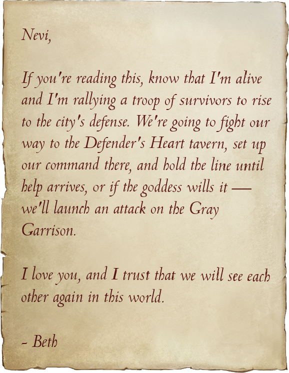The party gave Erodel and his people confirmation that the Defender's Heart had been secured, giving them a place to bring the civilians under their protection. Erodel thanked them, gave Elseth a parting hug, and expressed his remorse that the once gentle Elseth had been forced to take up a weapon. He then led his people into the streets once more. Elseth promised that they would soon meet again.