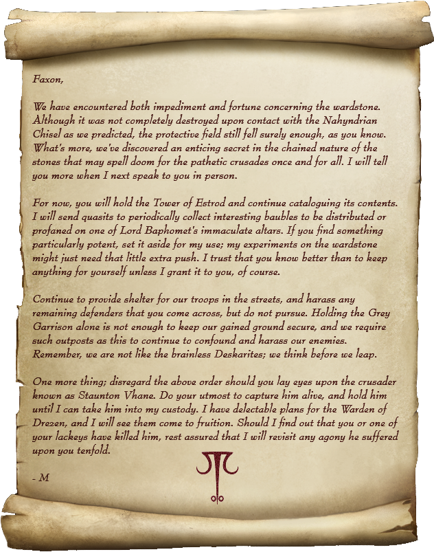The party took special concern with the mention of Staunton Vhane in the letter, as his infamy spawned from the loss of Drezen when he was tricked and seduced by the Minagho before the Second Crusade. Satomi noted that it was unusual for a demon to 'play with the same toy twice', making her wonder just what Minagho's goal was in capturing Staunton alive.