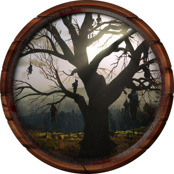 The trio departed, getting to know each other as they traveled. Eventually they chanced upon a crook in the road, upon which a toppled wagon laid before a gruesome sight; a tree from which several corpses were hung by nooses. Eight skeletal bodies wore black armor indicative of