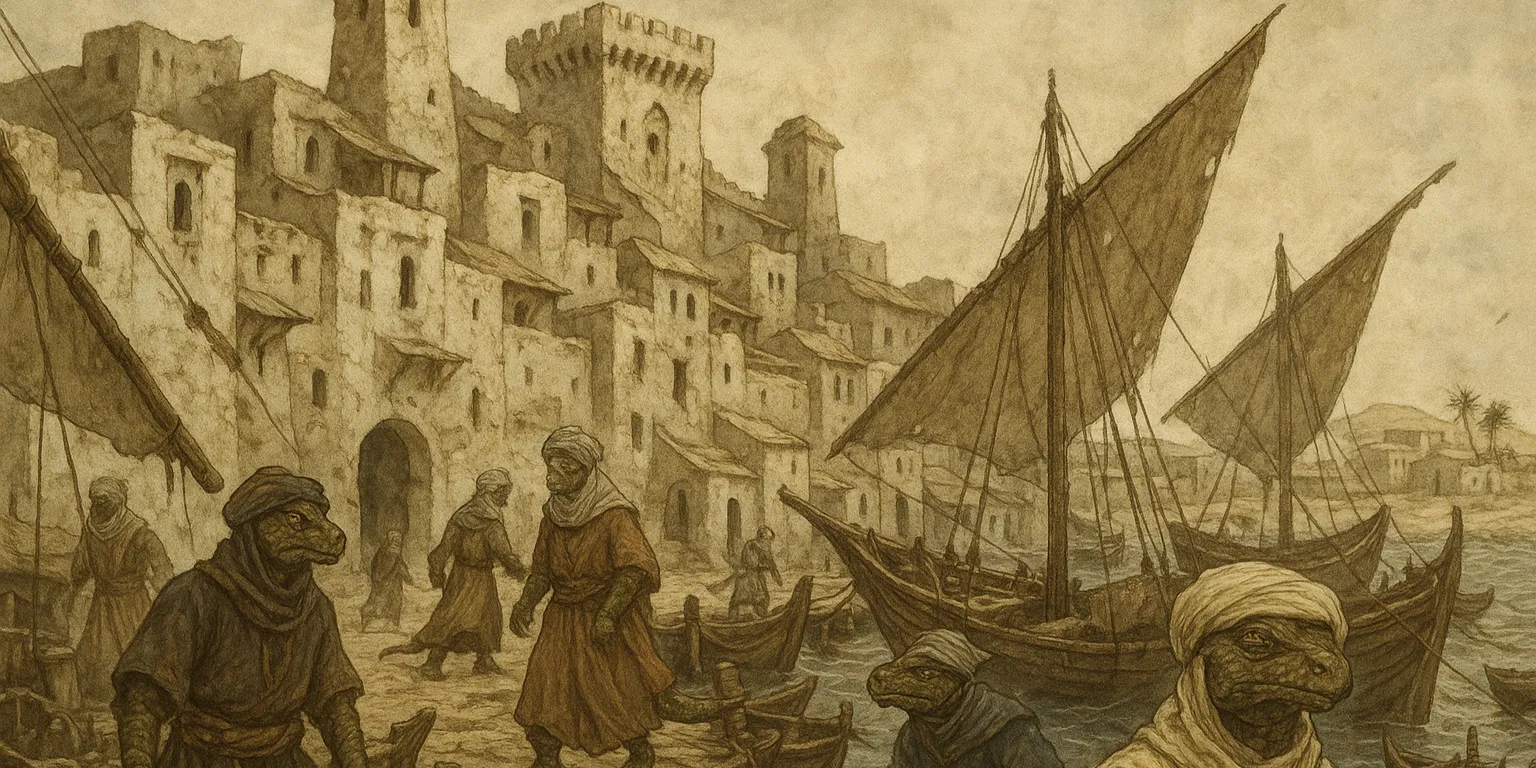 This left the Naga forces on Dzarbah without support, and the Tigzirin were quick to exploit their vulnerability. They had long since united against the conquest, but they had been unable to dislodge the Naga while support from the south continued. Once that support was gone, the Tigzirin rose up and drove the Naga from most of the island. The only place they failed to retake was the city of Almanfaa on the islands southeastern tip. Despite their overwhelming advantage in numbers, the Tigzirin were unable to take the city, and many claimed that it was shielded by magic that made any assault impossible. They spoke of uncanny ill luck: weapons slipping from attackers hands, blades shattering on defenders shields. Each assault collapsed without achieving much, and the conflict ground down into a long siege. In time, the Tigzirin and the Naga agreed to a truce, and the island was divided between two nations, the larger country of Tigzirt and the small city-state of Almanfaa.