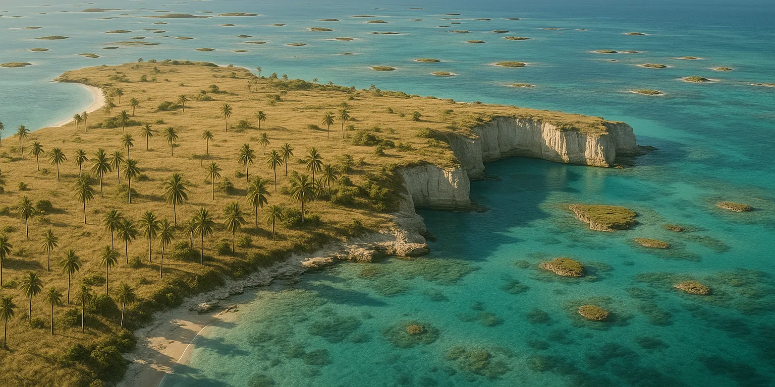 Panambay is a mostly low-lying island, covered in grassland and palm trees. The eastern region is higher than the west, with low white cliffs rising out of the sea along the eastern shore. The island does not have abundant fresh water - during the dry season, its rivers and streams run dry, and the inhabitants must rely on wells.