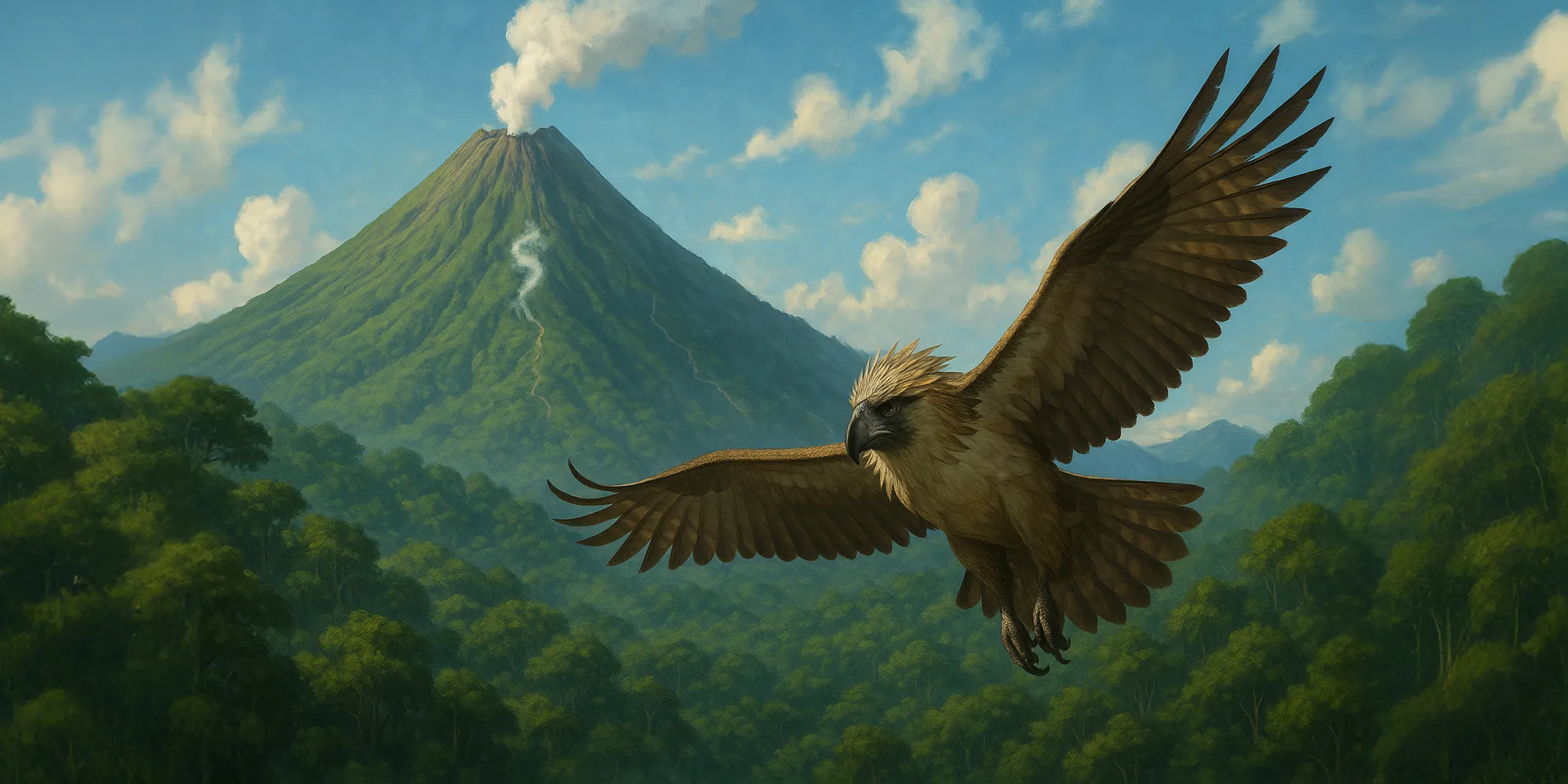 This formidable raptor can stand up to four feet tall, with a wingspan exceeding seven feet. It has a mane of shaggy brown feathers framing a dark face, and is famed - sometimes feared - for its habit of preying upon the monkeys that inhabit the surrounding forests.