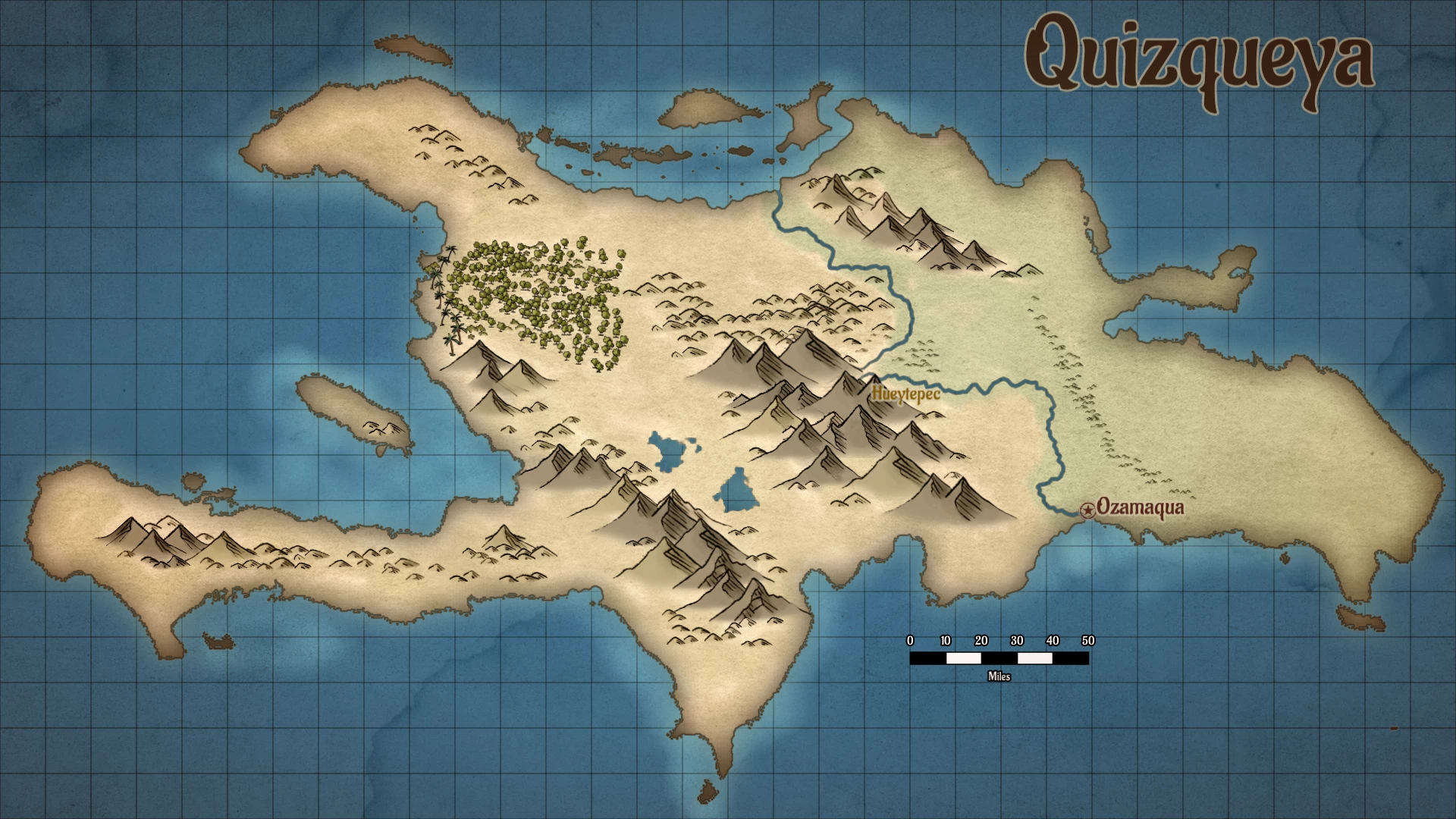 The largest settlement on Quizqueya is Ozamaqua, on the southern coast where the river Yollōtlāpan meets the sea. It is a port, though it primarily serves fishing boats and local vessels bound for the islands off Quizqueya's coast. The island lies far from the usual routes traveled by merchants of the Great Ring, and the Tecpāntin do not encourage foreign trade. While not forbidden, merchants receive little welcome, and those from the Cuāhcoāmeh are best advised to strike only a few bargains and avoid inviting a return visit.