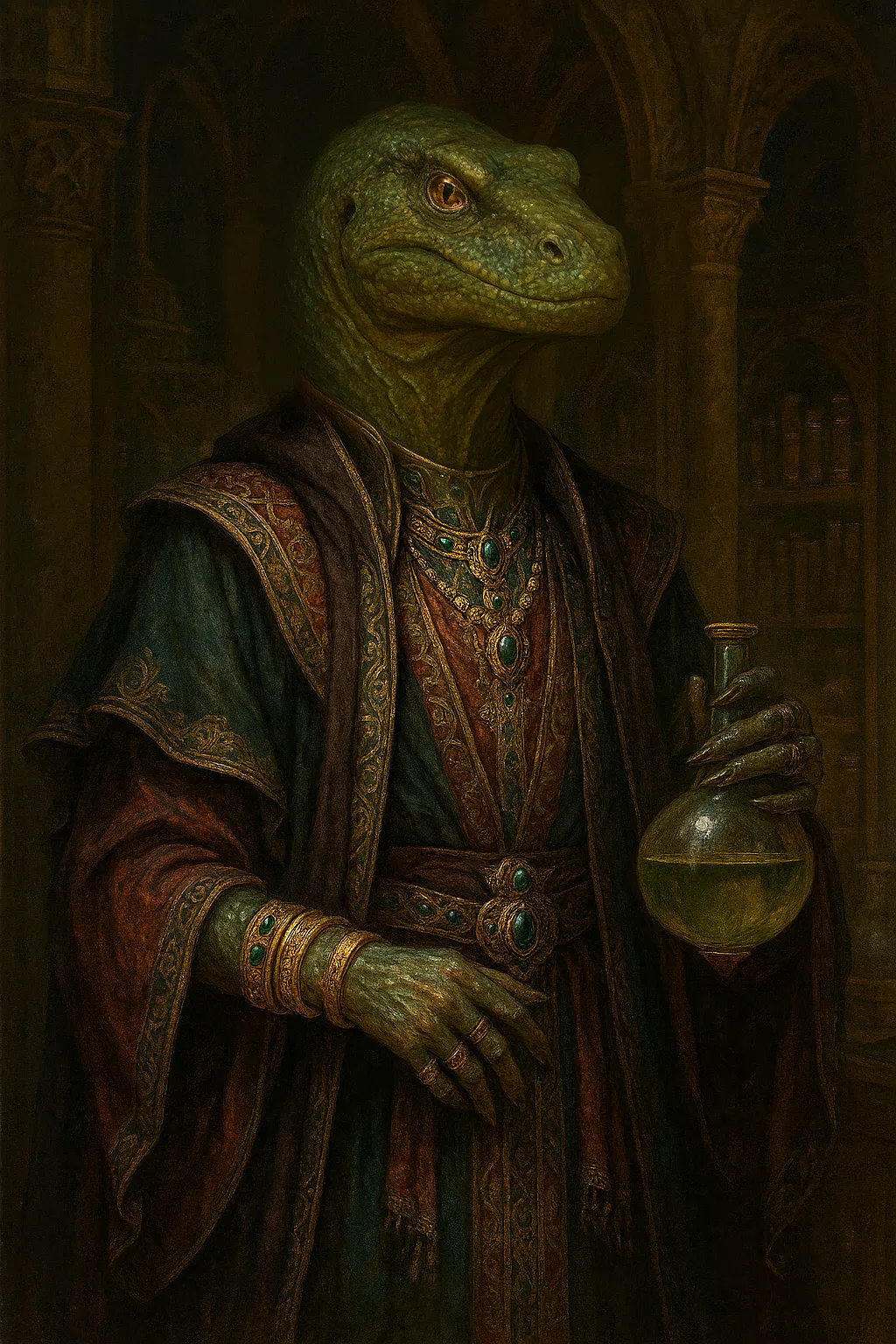 There is little known about the Naga True Mage who styles themself Sathradin al-Nahash. They are among the oldest and most powerful members of the Burj Alhikma, having joined the Malika's school of magic over four centuries ago. Since that time, al-Nahash has risen to become one of the most formidable figures within the Malikate of Saba, and may be counted among the most potent True Mages in the entire Great Ring.