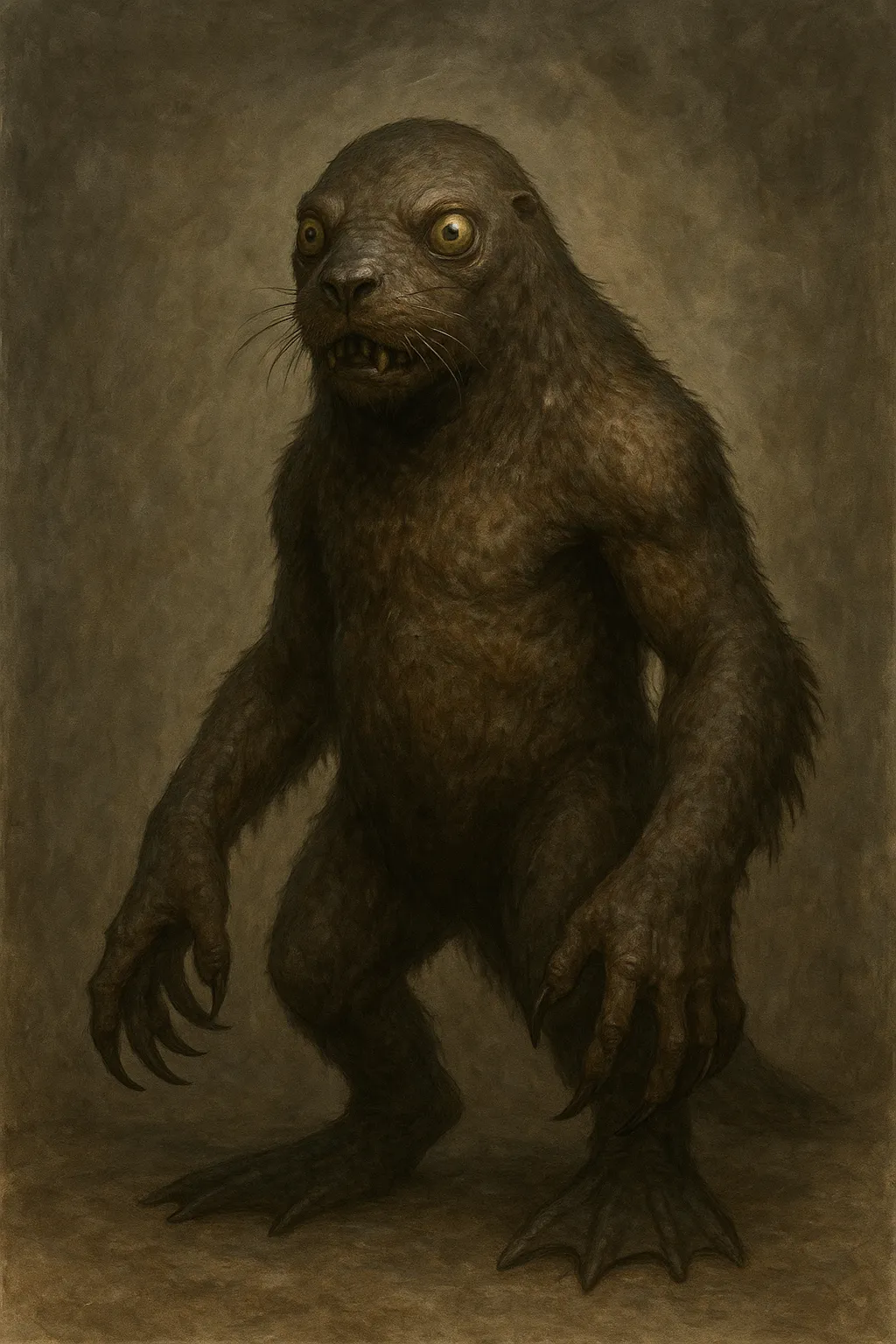TThe thousand children of Mòr Cuan Cailleach are known as the Sea-Trow, and they are a plague upon the inhabitants of the Norður Islands, the Arcaibh Islands, and the Kattalands. These hulking creatures would stand over nine feet tall if they rose upright. They have the heads and faces of sea lions, with bulging, goatlike eyes. Their bodies are covered in patchy fur, and their long arms end in massive, paddle-like hands tipped with sharp claws. Their lower bodies bear hind flippers like those of a sea lion, which they can rotate beneath themselves to support their weight when walking on all fours. Though they rarely move bipedally, they will rear up to slash with their claws and bite with their teeth. They also rear up to roar - a terrifying sound, half sea-lion bellow and half crashing wave.