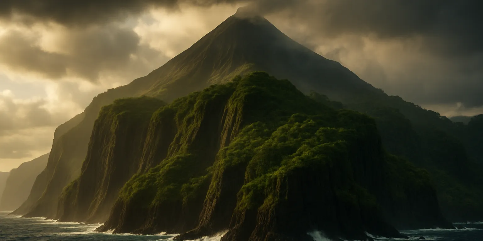 Serunda is an elongated volcanic island, stretching nearly fifteen miles from east to west and averaging about seven miles in width. It is steep and heavily forested in places, with the central volcano dominating both its landscape and its silhouette. The island rises sharply from deep water, its coastline marked by high cliffs. Only a handful of spots offer safe landing for ships, but from its heights Serunda commands an expansive view over the surrounding sea.