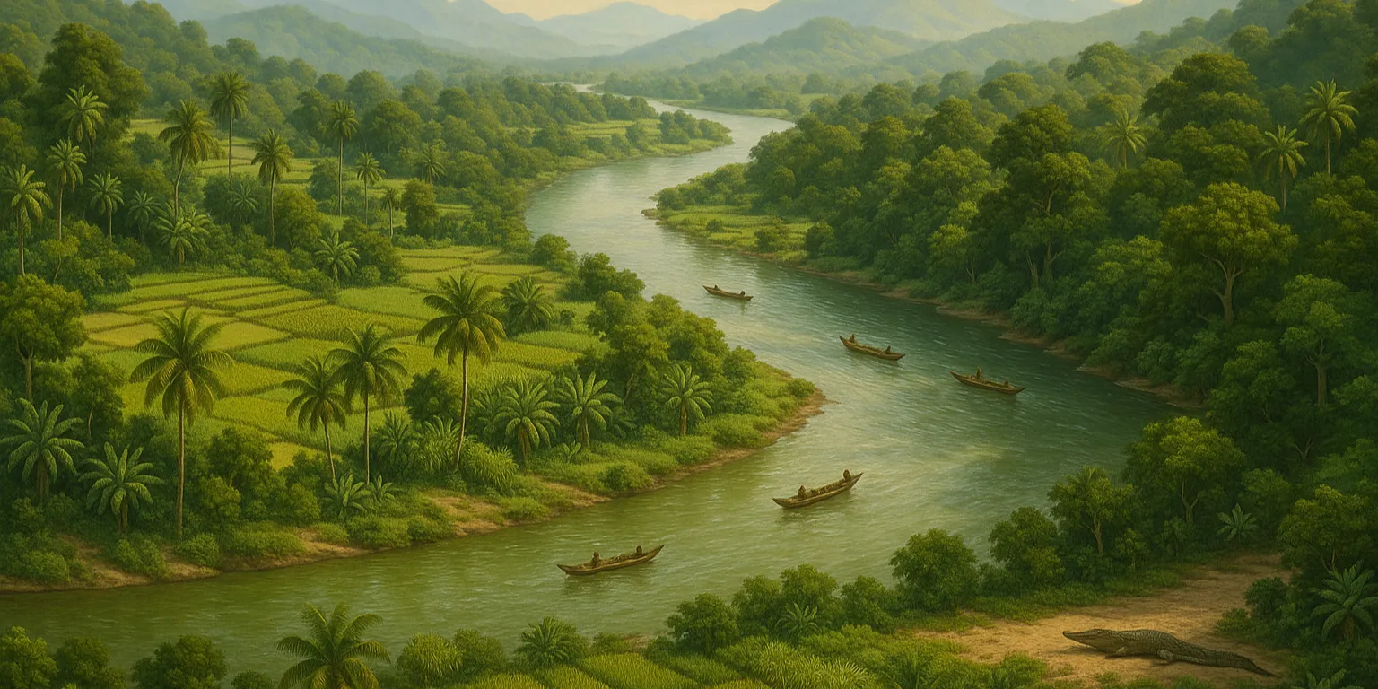 The Sungai Manambulu is the largest river on the island of Lahat. It flows through the island's most populous and productive regions, linking the capital city of Ratubala with the prosperous port of Kendari. When the Mekongga conquered Lahat and established their kingdom, they displaced most of the native Tau Tanah from the river's surroundings and settled their own people along its banks. Today, apart from a few Kosalo Villages preserved by royal mandate, the river valley is almost entirely Mekonggan in character and is regarded as the kingdom's heartland.