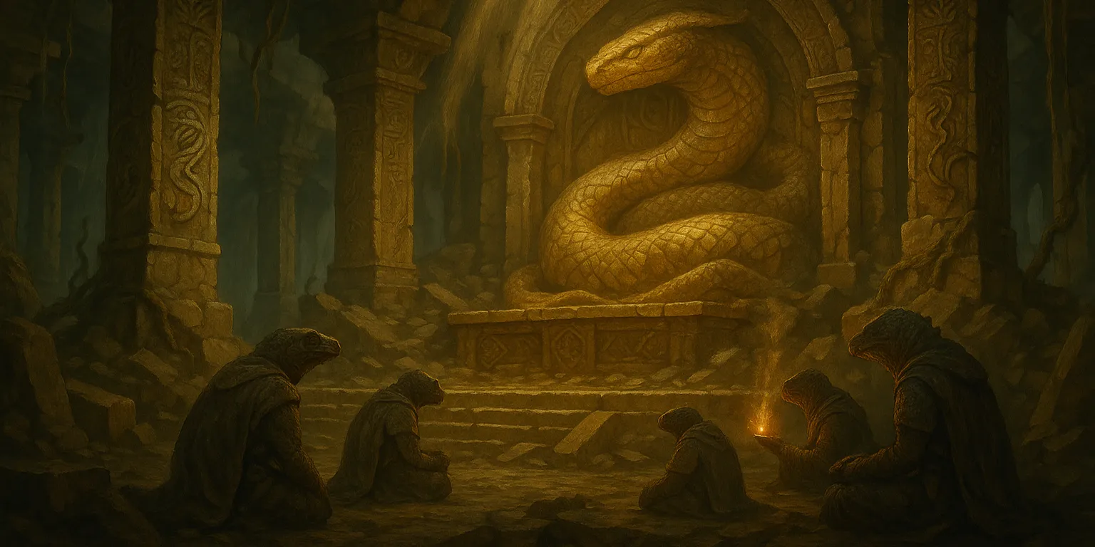 When the Malika of Saba established herself as the sole ruler of Saba and the Sabaen Archipelago, she sought out and destroyed every shrine to Vashirak she could find. The Naga who still hoped for their god's return did their best to conceal their worship, and many fled the Southeastern Region of the Great Ring, establishing Naga communities across its southern arc, where they could venerate Vashirak openly. On Saba, however, this worship went underground - both figuratively and literally. Since Vashirak was said to sleep deep beneath the mountains of Saba, the Naga built their hidden shrines below the ruins of the Nagarajya, where they could connect to the slumbering serpent and evade the scrutiny of the Malika and her Glass Shadows.