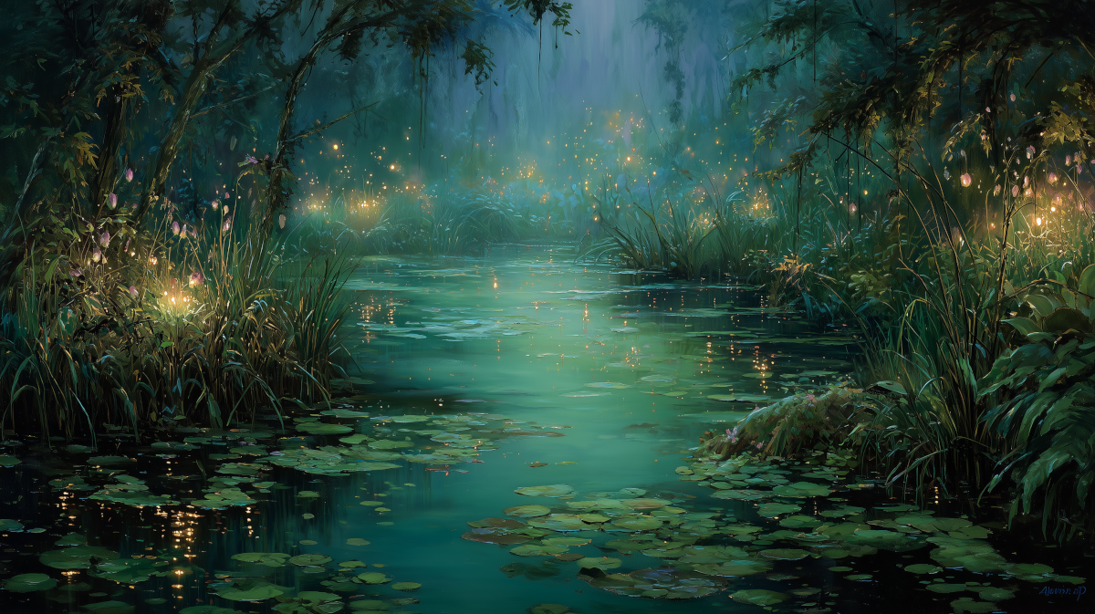 The Mossmere is a quiet, enchanted wetland, a place where light and shadow, growth and stillness, motion and calm all coexist in delicate balance. Pools of water shimmer with starlight, soft mists drift through the reeds, and warm, glowing blooms hang like lanterns along the banks. Life here is small, interconnected, and full of gentle magic: frogs and toads, woodland creatures, and mossy plants thrive under the care of those who stand as Merewards.