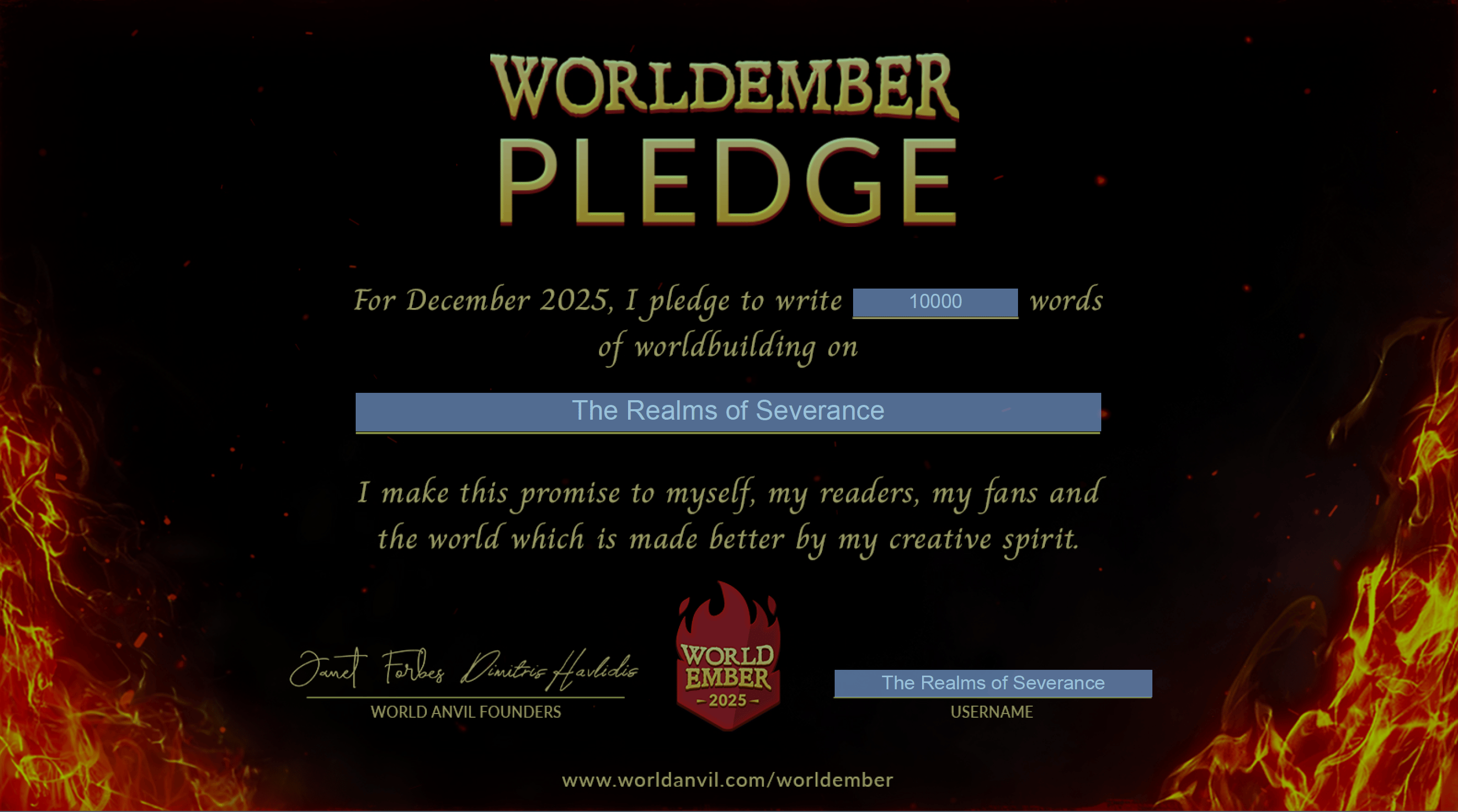 As someone who's new to world anvil, I'm setting my goals low, but I want to give this a good go, so I'd like to write at least 10K words to help flesh out The Realms of Severance! I'd like to do more but I unfortunately have a job and will be running sessions bi-weekly. I do intend to figure out how the session planner works in this sand maybe add my players into this so people can follow along with the various shenanigans that happen in Atla (that's the name of the world).