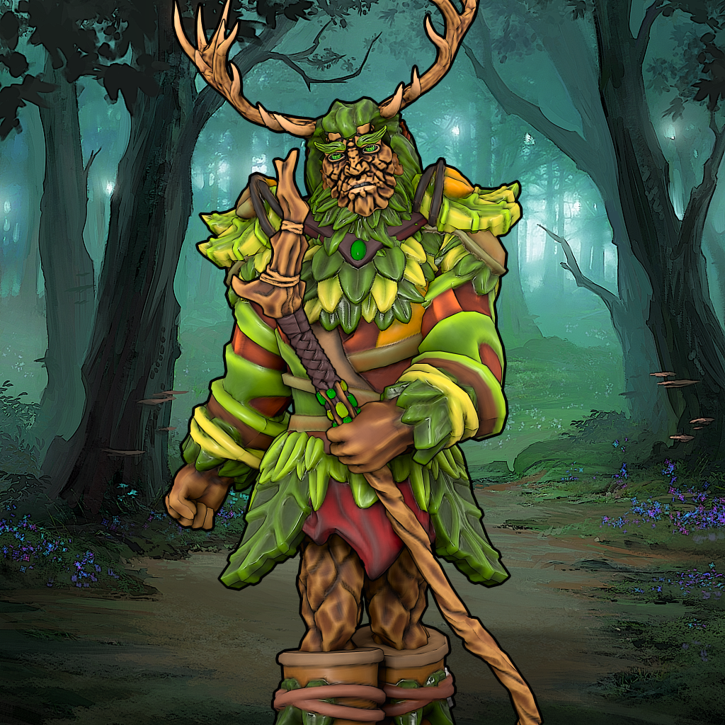 Silvanus, god of nature, is most often shown as a tall humanoid of indeterminate species. His skin is made of ochre earth, his hair and robes made of grass, and large antlers protrude from both sides of his head. Because Silvanus strictly adheres to neutrality, he is a rival of Serrenna . Silvanus plays a shalm (a double-reed woodwind musical instrument, also spelled “shawm”) and also carries a staff.
